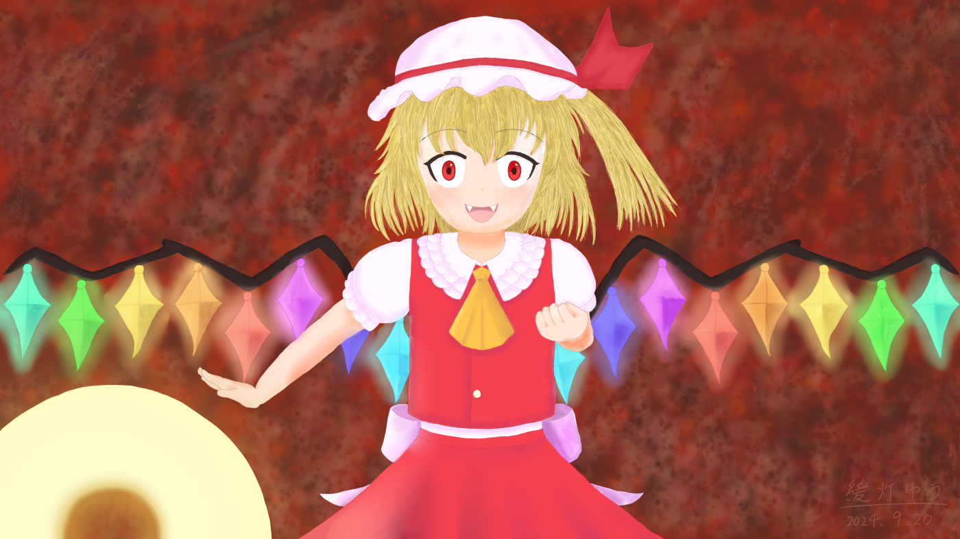 戦闘狂『フランドール・スカーレット』 二次創作 2025.12.262026.02.27 形態:二次創作 制作日:2024年9月20日 キャラ名:フランドール・スカーレット シリーズ名:東方Project 東方Projectの『フランドール・スカーレット』です。 弾幕勝負が楽しすぎて、激しくはしゃぐ彼女を描きました